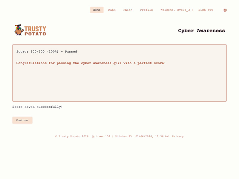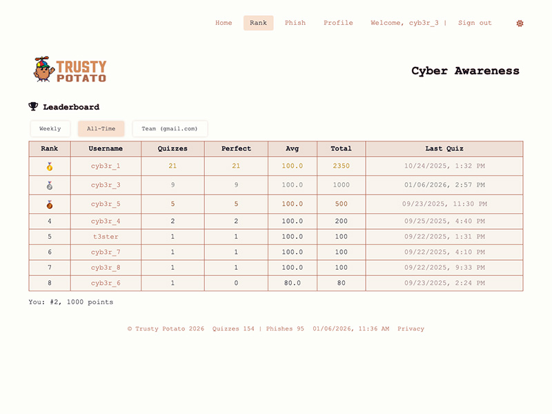 The core loop is live and stable: daily refresh → quiz/phish generation → user engagement → leaderboards. As of January 2026, Trusty Potato has served over 150 quizzes and 95 phish simulations.