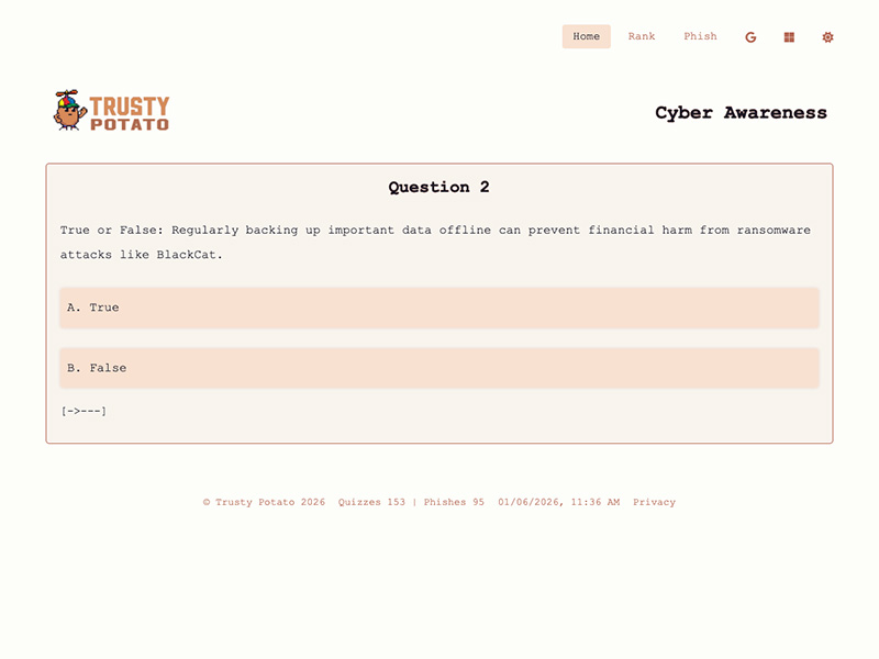 Trusty Potato is a lightweight, always-fresh web app that turns cybersecurity awareness into a quick daily habit. Every day it pulls the latest security headlines and generates new quizzes + phishing simulations so users can test themselves against current threats via retro aesthetic with a friendly potato mascot.