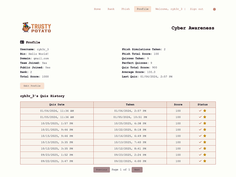 - Profiles track total score, perfect quizzes, phish completions, and history